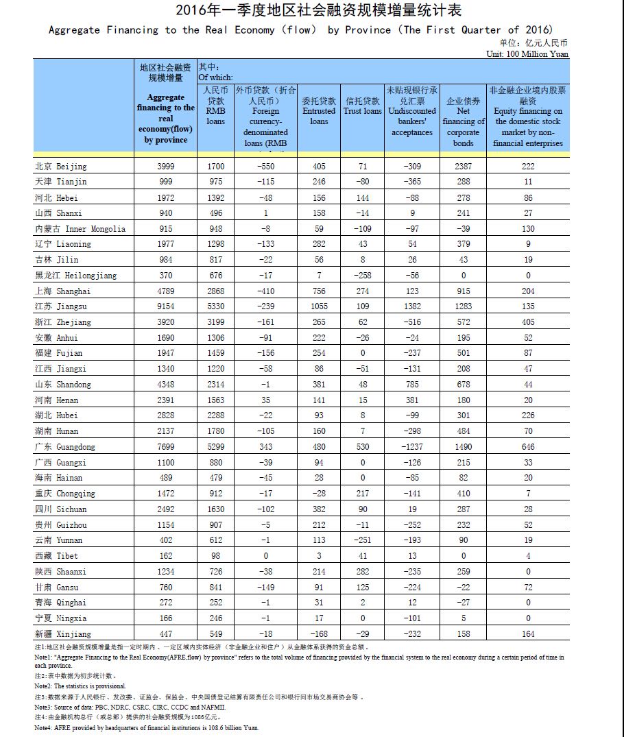2016年一季度地区社会融资规模增量统计数据